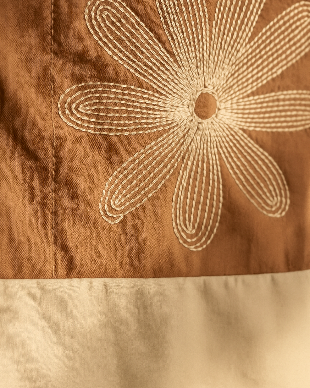 Crafted from soft, quilted cotton in a terracotta caramel tone, Juliette features hand-embroidered floral stitching reminiscent of late-summer daisies, bringing a touch of artisanal charm to your daily routine. The contrasting cream base adds a refined structure, while the long padded straps and a dainty fabric tie closure lend both comfort and femininity.